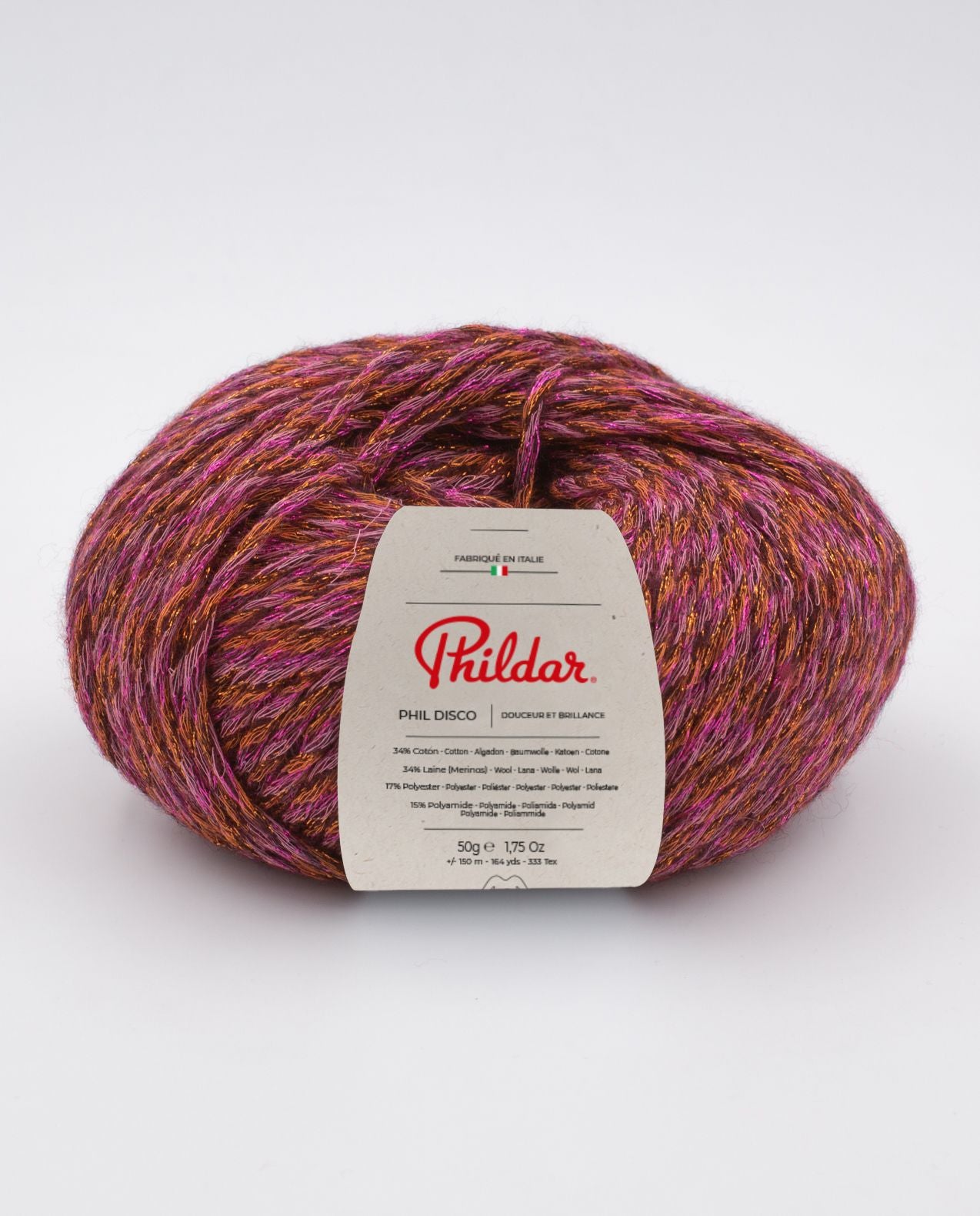 - 34% Coton 34% Laine (merinos) 17% Polyester metallise 15% Polyamide